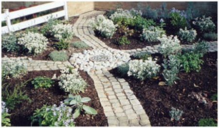A spiral set with blue glass forms the centrepiece for a softly planted front garden, quartered with cobbled pathways.